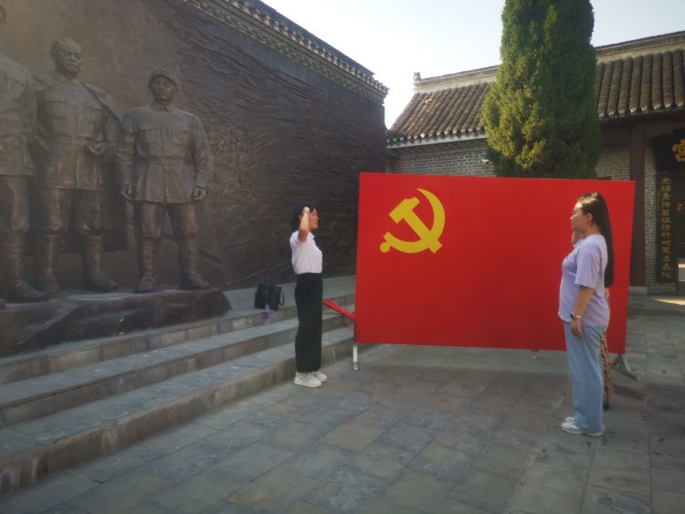 黨員們面對淮海戰(zhàn)役英勇犧牲的戰(zhàn)士照片前駐足默哀,向革命先烈們敬禮!在總前委銅塑雕像前新黨員們莊嚴宣誓,老黨員重溫入黨初心!在黨的領(lǐng)導人題詞的烈士紀念碑前久久凝視,不忍離去!