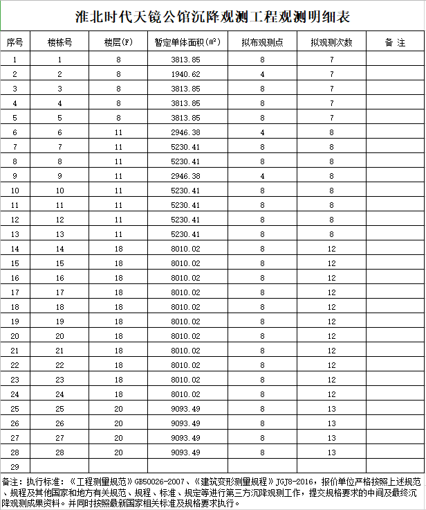 3、工程委托日期:自委托日起至整個(gè)施工過程沉降及竣工驗(yàn)收后一年內(nèi)(如滿足沉降規(guī)范范圍合格可停止觀測如不滿足規(guī)范需自行增加觀測直至沉降滿足規(guī)范標(biāo)準(zhǔn)后停止,費(fèi)用包含在總價(jià)內(nèi))為沉降觀測期?!?br /> 4、沉降觀測任務(wù)(內(nèi)容)與執(zhí)行技術(shù)標(biāo)準(zhǔn):