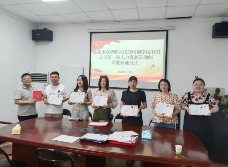 2023年6月13日,勞代公司淮北市眾幫職業(yè)技能培訓學校為第一期38名學員頒發(fā)了企業(yè)人力資源管理師證書,通過率達99%。我校利用周末時間以線上+線下結(jié)合的教學模式開展企業(yè)人力資源管理師培訓,培訓教師通過舉實例、現(xiàn)場提問、模擬現(xiàn)實場景的方法,宣講了從事企業(yè)人力資源管理工作的方法和經(jīng)驗,進一步提升了培訓學員的工作能力,規(guī)范了學員在從事企業(yè)人力資源管理工作中的操作方法和工作流程。形成“培訓—技能提高—企業(yè)發(fā)展—再培訓”的發(fā)展模式,讓學員真正做到學以致用。