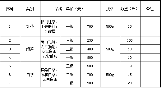 本項目是淮北市建投控股集團有限公司2021年度茶葉采購項目,具體如下:![]() 注;1、二級三級茶葉采用盒裝或罐裝包裝,一級采用禮品裝包裝(以采購方實際需求為準(zhǔn))。 2、重量為除去包裝后茶葉凈重要求。 3、本次茶葉采購具體數(shù)量可能略有變化,按照實際采購數(shù)量確定。 |