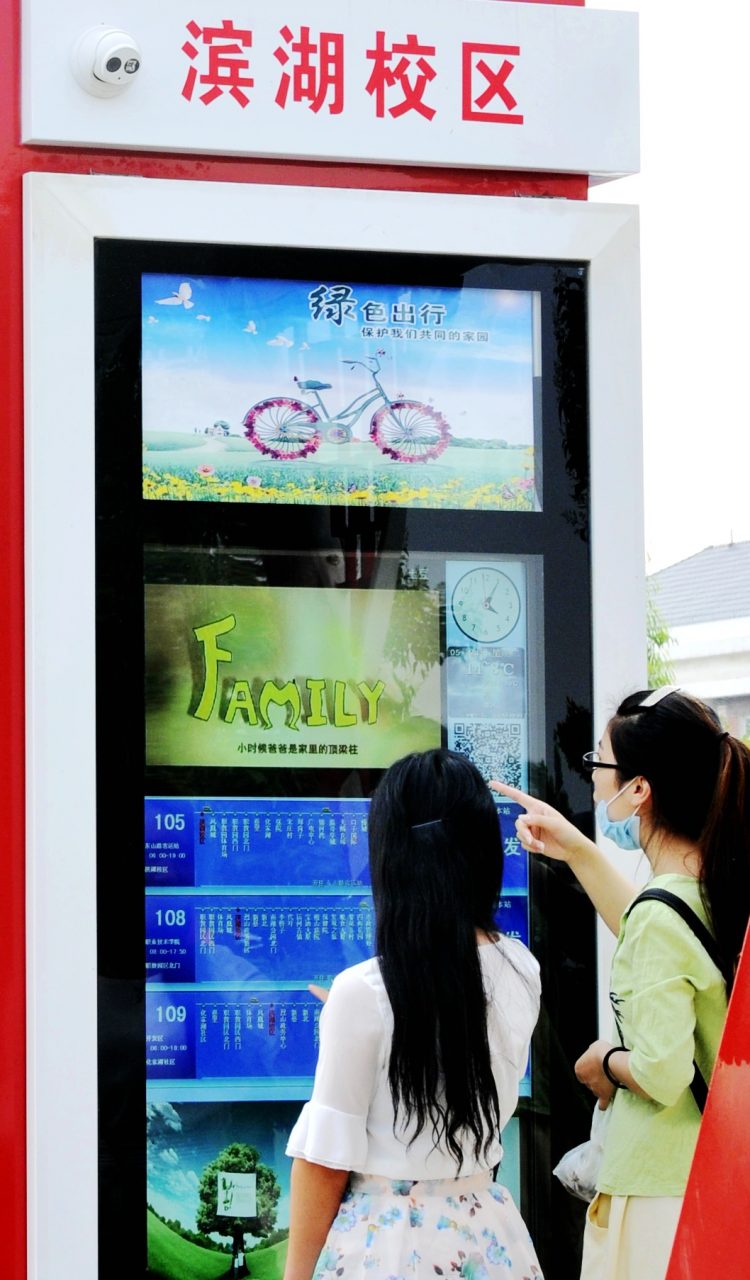 電子公交站牌還沒裝好,就引來了不少大學生的圍觀。電子站牌采用戶外高亮55寸LCD屏,由號位、視頻、LED屏、公交線路四部分組成,分屏顯示公交車到站信息、視頻廣告、公益宣傳、二維碼掃描、時鐘信息、微信平臺等多種信息,減少市民候車的枯燥,視頻右側(cè)增加了蘋果版和安卓版的“淮北汽運”微信公眾號二維碼,視頻下方,則滾動顯示公交線路的站點、運行時間等詳細信息,電子站牌最下端還可以實時更新當天的天氣預報。同時結(jié)合站牌背面滾動系統(tǒng)可以增加宣傳力度,系統(tǒng)刷新5秒一次,一目了然地看到公交車輛運行的信息,途經(jīng)該站點由哪幾路公交線路,有幾臺車在各線路上運行,各線路那臺車離該站臺近,結(jié)合微信公交讓廣大市民可以做到掐點等車、守時候車。