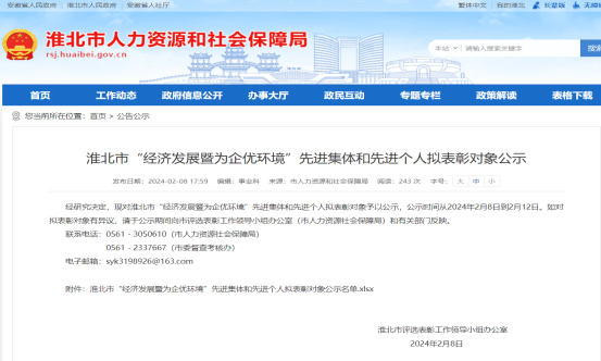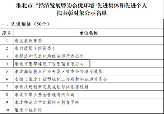 近日,由淮北市評選表彰工作領(lǐng)導(dǎo)小組辦公室(淮北市人力資源社會保障局)組織對2023年度淮北市“經(jīng)濟發(fā)展暨為企優(yōu)環(huán)境”先進集體和先進個人進行了表彰,淮北市惠黎建設(shè)工程管理有限公司榮登“先進集體”榮譽榜頭部。