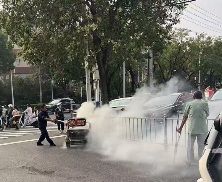 2025年6月11日上午7時(shí)41分許,淮北市保安有限公司武裝押運(yùn)一中隊(duì)W699Y車(chē)組行駛至建設(shè)銀行西城支行網(wǎng)點(diǎn)路口時(shí),突遇一輛三輪電動(dòng)車(chē)自燃,火苗從車(chē)底迅猛竄出,騎車(chē)?yán)先梭@慌失措,周邊群眾紛紛后退。時(shí)值早高峰,車(chē)流人流密集,如不及時(shí)處置,后果不堪設(shè)想。
