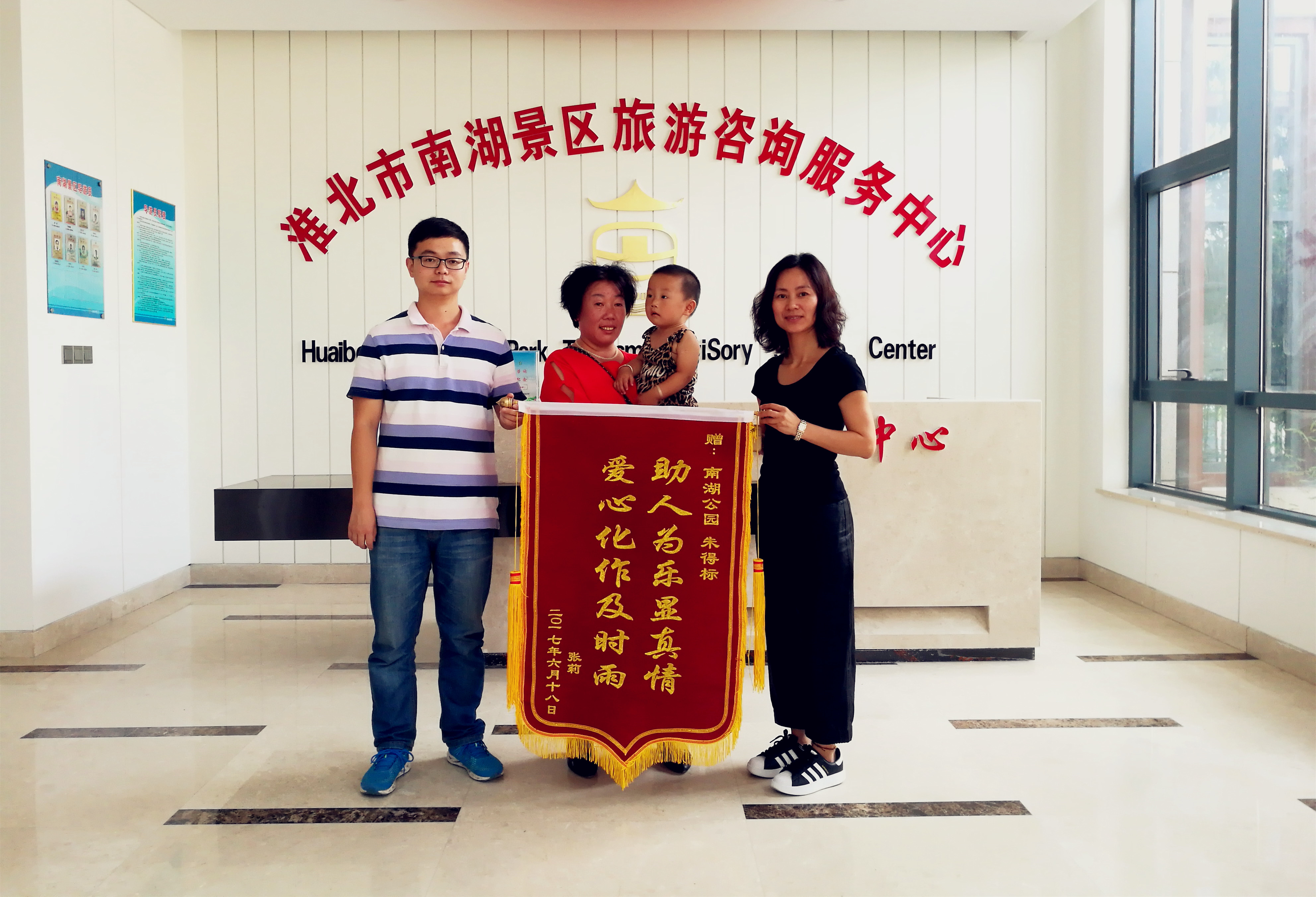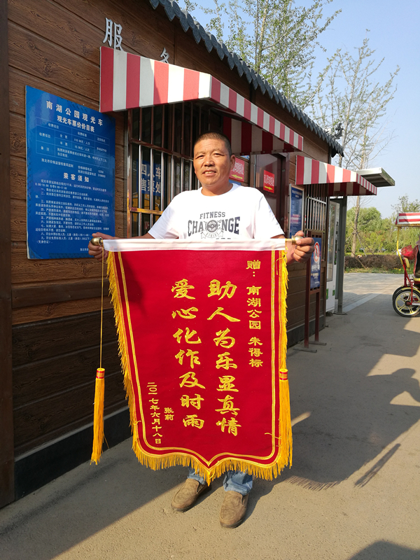 在朱班長(zhǎng)和景區(qū)工作人員的共同努力下,于在當(dāng)天下午聯(lián)系到了失主張女士,并將她丟失的背包轉(zhuǎn)交給了她本人??粗Ф鴱?fù)得的背包,張女士十分感動(dòng)。6月26日上午張女士再次來(lái)到南湖景區(qū)游客服務(wù)中心,向景區(qū)員工以及拾金不昧的朱班長(zhǎng)分別表示了感謝,并向拾金不昧的朱班長(zhǎng)送來(lái)了錦旗。