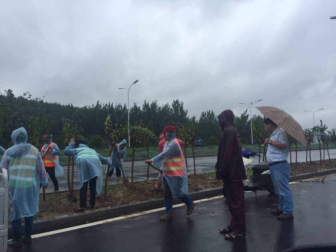9月10日,公司工程部員工冒著瓢潑大雨在市政府重點工程—梧桐路工程的施工工地上進行綠化施工。據(jù)工程部部長張勇介紹,為了響應(yīng)市政府創(chuàng)建工作,抓住雨天種植綠化樹木的成活率高,調(diào)動公司各部門加班加點,克服雨中施工的困難,為創(chuàng)建工作做出最大努力。