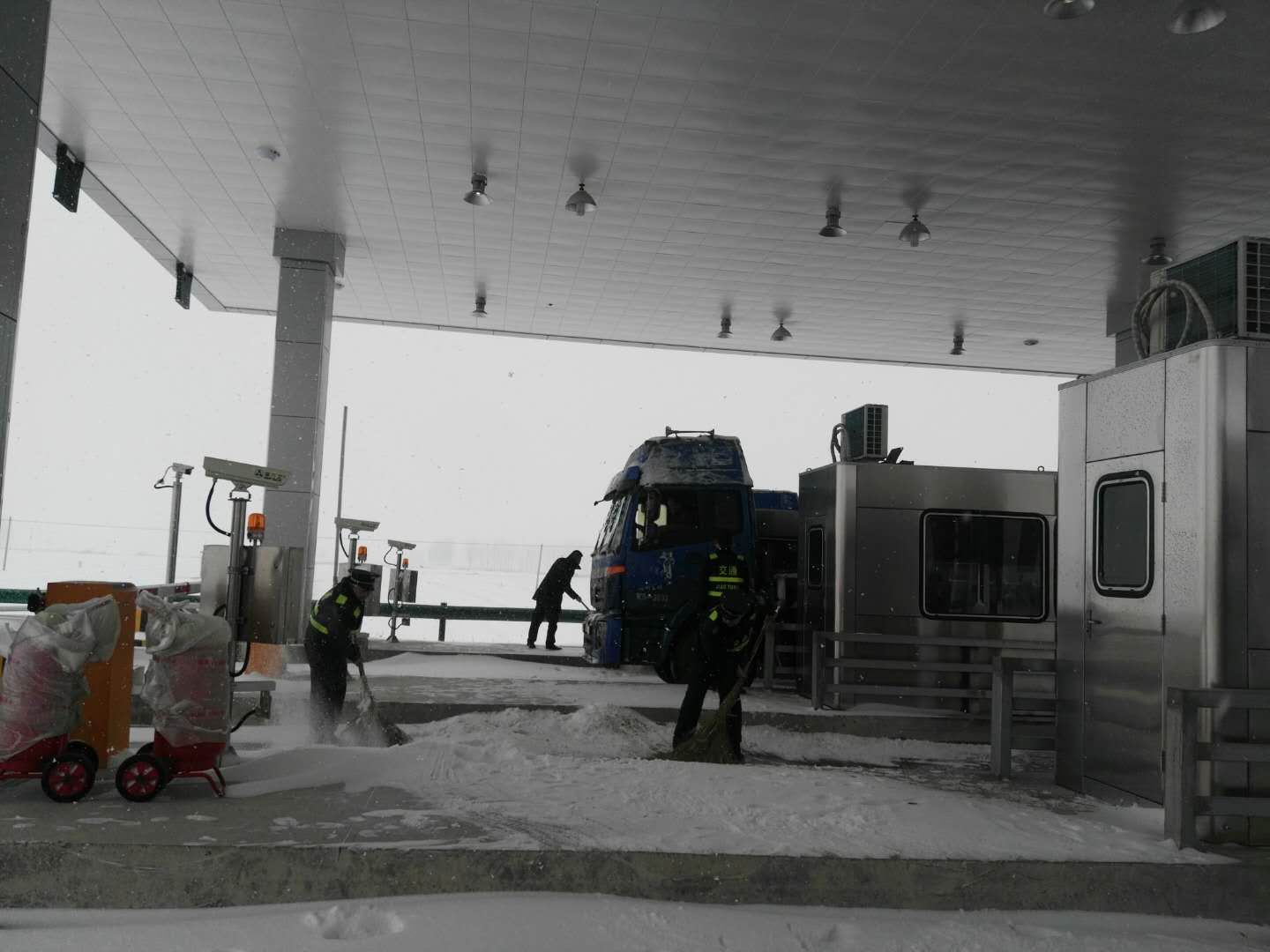 為給過往司乘人員創(chuàng)造安全的行車環(huán)境,保障過往車輛的順利通行,S202收費(fèi)站工作人員冒著風(fēng)雪拿起掃把、鐵鍬等工具,迎刺骨的寒風(fēng)到收費(fèi)廣場(chǎng)、車道進(jìn)行除雪,僅用2小時(shí)的功夫,收費(fèi)車道及廣場(chǎng)的積雪全部清除完畢。清掃工作結(jié)束后,站長(zhǎng)要求當(dāng)班值班干部及收費(fèi)員盡量做到“雪隨下隨除”,確保了收費(fèi)區(qū)域的安全通暢。、