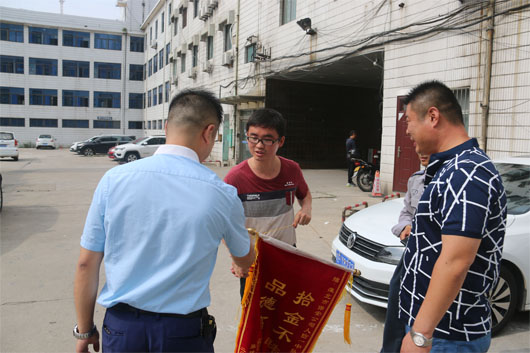 2018年6月19日10時,淮北市保安有限公司派駐淮北車管所人防一中隊隊員房德寶在大廳巡邏執(zhí)勤時拾到一錢包,內(nèi)有機動車駕駛證、多張銀行卡、身份證件及現(xiàn)金600元。第一時間交給車管所領導并通過數(shù)據(jù)系統(tǒng)與家住亳州市渦陽縣的張建飛取得聯(lián)系。失主表示萬分感謝,并為公司送來錦旗。