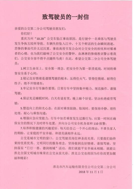 因此,公交第二分公司組織全體駕駛員進(jìn)行警示教育學(xué)習(xí),并向每一位公交司機(jī)師傅致一封信,讓師傅們時(shí)刻牢記作為司機(jī),當(dāng)你坐在駕駛座上,手握方向盤時(shí),就應(yīng)有清晰的認(rèn)識(shí)。此時(shí)你握著的,不僅僅是自己的性命,更是與你同車的人、和路上與你擦肩而過(guò)的無(wú)數(shù)人的安全。平白無(wú)故挨了打,怒從膽邊生,生氣都在所難免。時(shí)刻樹(shù)立生命至上、安全第一理念,把安全作為第一職責(zé)底線,將乘客安全系于心間。