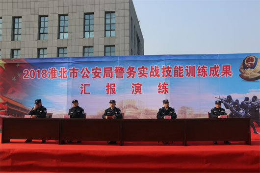 2018年12月25日上午9:25分,淮北市公安局警務(wù)實(shí)戰(zhàn)技能訓(xùn)練成果匯報(bào)表演在市交警支隊(duì)訓(xùn)練基地拉開序幕?;幢笔泄簿贮h委書記兼公安局長(zhǎng)章銀發(fā)以及公安局所有二級(jí)機(jī)構(gòu)人員參加。