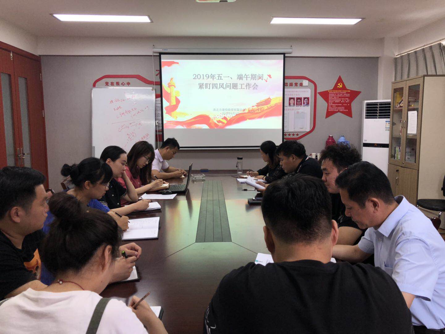 2019年6月3日下午,商貿(mào)公司總經(jīng)理周敬安,副總經(jīng)理金曉莉主持召開2019年“五一”、端午期間緊盯四風問題工作專題會議。